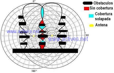 Más abajo, se muestra diagrama del campo de dos antenas y cómo podrían afectarle los obstáculos (en negro), las sombras (o zonas sin cobertura; en rojo) poca o nula señal, zonas de solapamiento de señal (en azul), y en la que el módulo suplicante (receptor-emisor del terminal móvil) decide mediante “roaming” a qué antena debe conectarse.