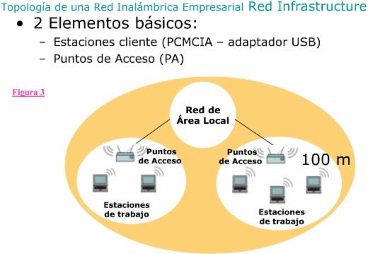 a) Red WI-FI de Infraestructura: Esta arquitectura se basa en 2 elementos: uno, o más Puntos de Acceso y Estaciones Cliente (fijas o móviles) que se conectan al servidor a través del Punto de Acceso.